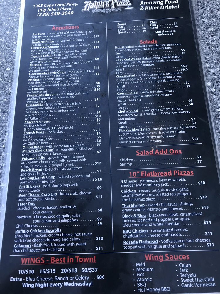 Ralph's Place is a hidden gem located in Cape Coral, FL, offering a unique combination of bars, chicken wings, and American cuisine. This casual dining spot is perfect for those looking for a relaxing atmosphere and top-notch food.